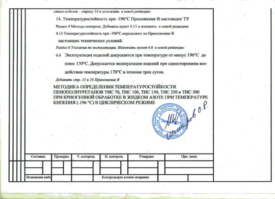 Согласно разработанной методики определения температуростойкости пенополиуретанов ППУ, марок ТИС70, ТИС100, ТИС150, ТИС250, ТИС300, Приложение В, и проведением испытаний в Федеральном гусударственном бюджетном учреждении науки «Институт физики твердого тела имени Ю. А. Осипьяна» Российской академии наук, внести изменения (дополнения) в ТУ по температуростойкости изделий из пенополиуретана жесткого литьевого, расширить диапазон температуры применения изделий применения от -196 °С до +130 °С, с кратковременным повышением температуры при одностороннем температурном воздействии до +170 °С, в течение трех суток.