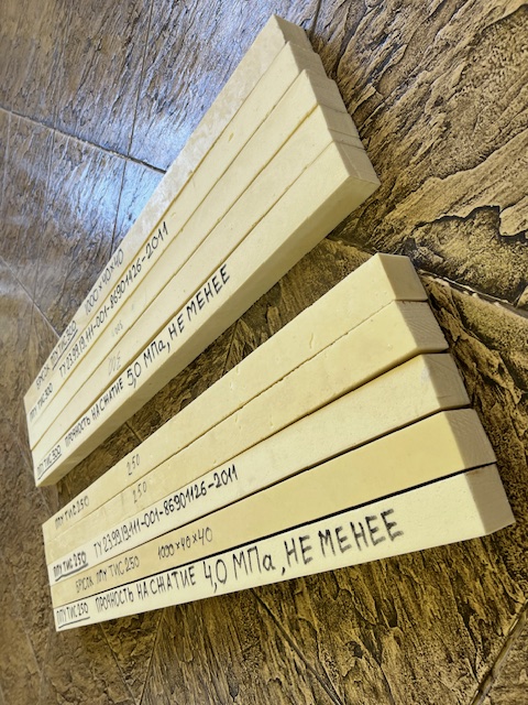 Были произведены плиты марки ППУ ТИС250 и ППУ ТИС300 с размерами 500*500*14 мм и бруски марки ППУ ТИС250 и ППУ ТИС300 с размерами 1000*40*40 мм.