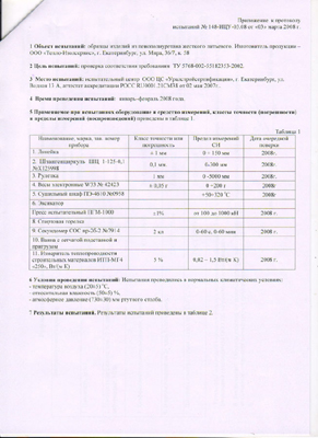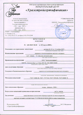 3 Марта 2008 года Компанией Тепло-изолсервис (завод "ТИС" ) получен протокол испытаний на изделия из пенополиуретана жесткого литьевого ( ТУ 5768-002-55182353-2002 ) выданый аккредитованым Центром сертификации "Уралстройсертификация" на основании договора № 191 от 13 Ноября 2007 года. Дата испытания образцов Январь-Февраль 2008 года. Заключение : Представленные на испытания образцы из пенополиуретана жесткого литьевого соответствуют ТУ 5768-002-55182353-2002 полностью по всем показателям.